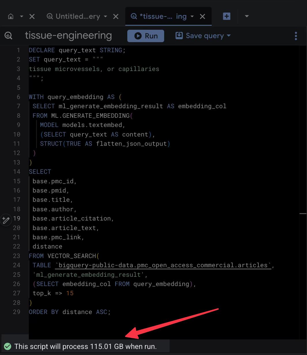 I started by the exact same query and deleted one line: base.article_text and hit run. The results came back just as fast, giving me the IDs, titles, and authors of the most relevant papers. But the data processed dropped from 115 GB down to 13ish GB.