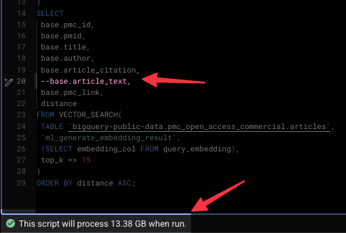 When I ran that standard query, BigQuery had to scan the embedding column to do the math, but because I requested SELECT base.article_text, it also decided to haul back that massive text column along for the ride. That’s what led to the 100+ GB of data.